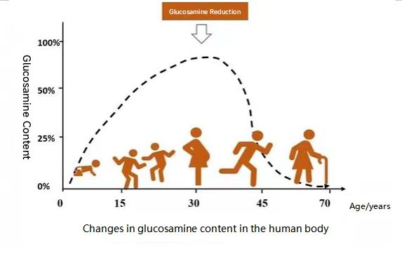 Ammonia sugar is an inherent component of the human body and is the main forming substance of cartilage. The 2% to 5% 6-phospho-fructose produced by human glycolysis enters the hexosamine metabolic pathway through glucosamine, producing 4 to 20 g of endogenous glucosamine per day. Medical research has found that the content of ammonia sugar in the body varies with age (Figure 2), which determines the ability of people to exercise at different ages. Around the age of 30, the ammonia sugar in the body is gradually lost and no longer synthesized, and the exercise ability is decreased. After the age of 45, the amount of ammonia sugar in the body decreases to 18% of that in the adolescent period, and most people no longer like to exercise. After the age of 60, the content of ammonia sugar in the body has been minimal, the ability to exercise is low, and some people have frequent joint pain and other problems.